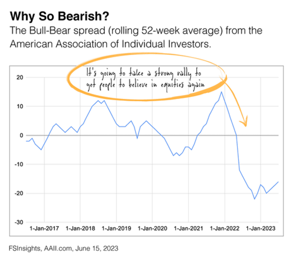 In the accompanying chart, you can see individual investors remain mostly “out” despite the stock market’s 2023 rally.1