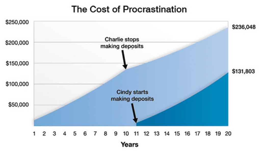Though Mark Twain famously quipped, “Never put off until tomorrow what you can do the day after tomorrow,” we know that procrastination can be detrimental, both in our personal and professional lives. Problems with procrastination in the business world have led to a sizable industry in books, articles, workshops, videos, and other products created to deal with the issue. There are a number of theories about why people procrastinate, but whatever the psychology behind it, procrastination may cost money—particularly when investments and financial decisions are put off.