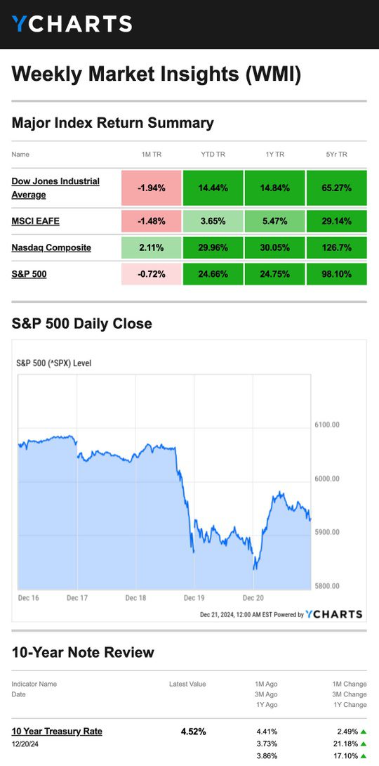 Source: YCharts.com, December 21, 2024. Weekly performance is measured from Monday, December 16, to Friday, December 20. TR = total return for the index, which includes any dividends as well as any other cash distributions during the period. Treasury note yield is expressed in basis points.