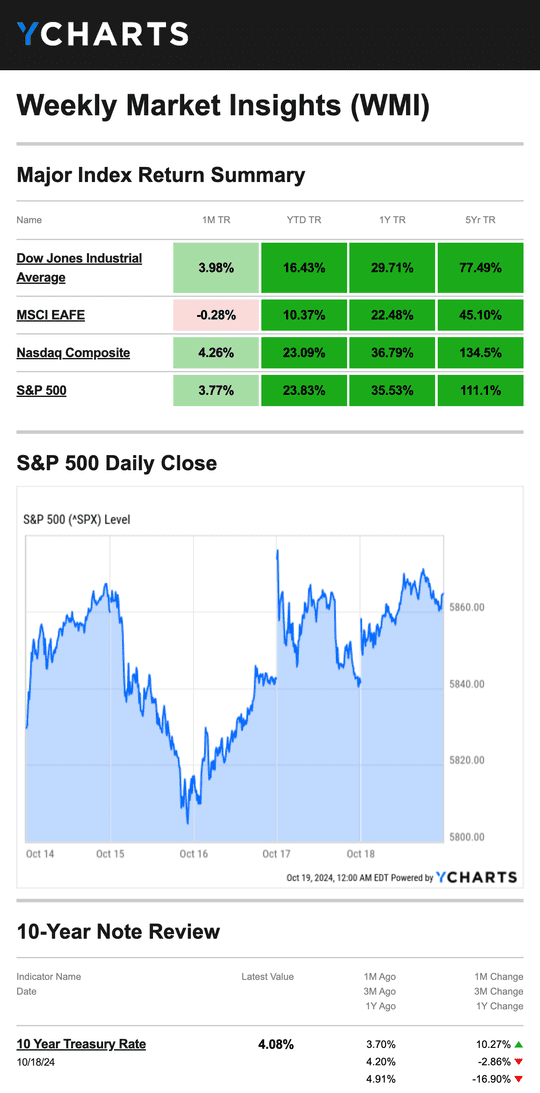 Source: YCharts.com, October 19, 2024. Weekly performance is measured from Monday, October 14, to Friday, October 18. TR = total return for the index, which includes any dividends as well as any other cash distributions during the period. Treasury note yield is expressed in basis points.