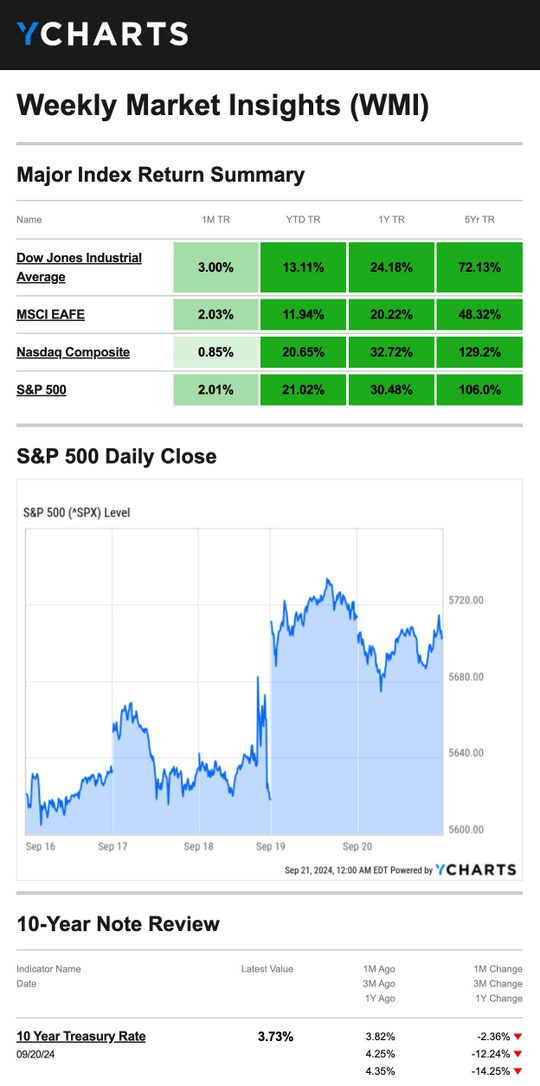 Stocks moved higher last week after the Federal Reserve’s half-point rate cut, bolstered by multiple data points supporting a cooling but still strong economy and decelerating inflation.